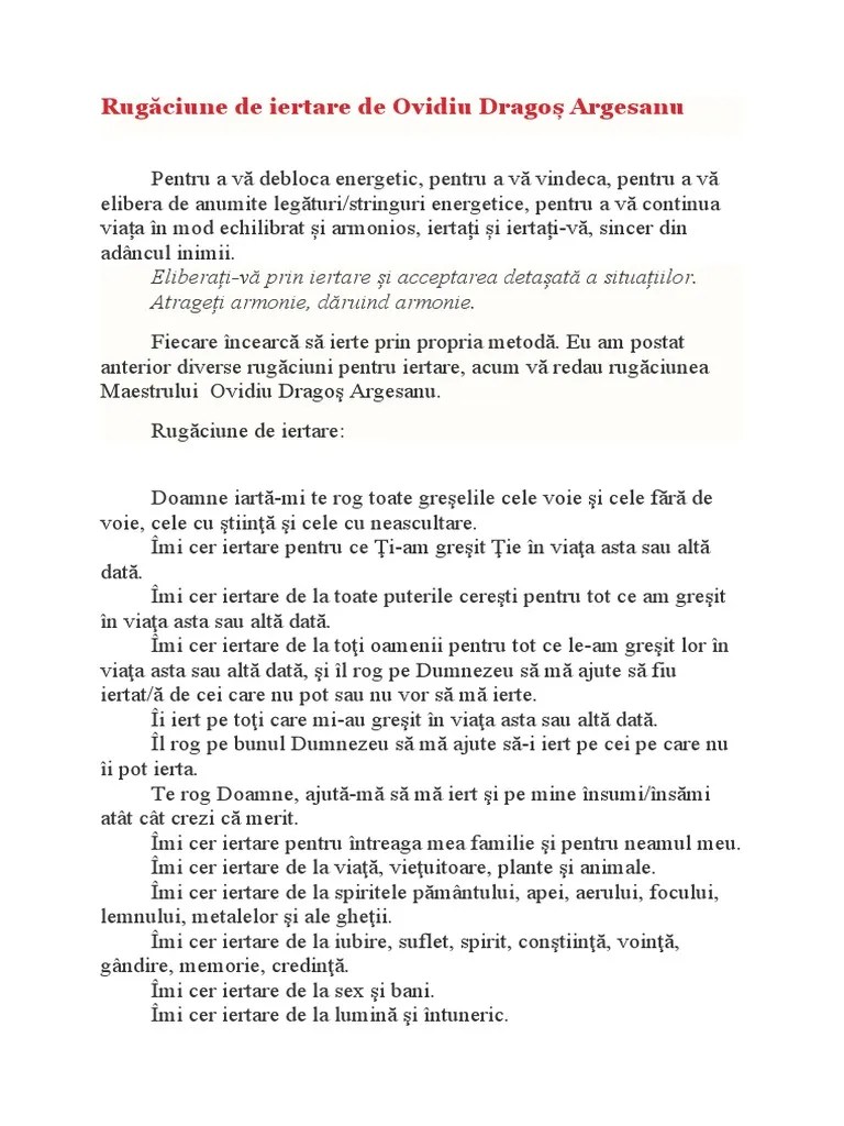 Aceasta rugaciune este facuta de ovidiu dragos argesanu.. 03.06.2016 · rugaciune de iertare (de ovidiu dragos argesanu) iunie 3, 2016. 19.12.2018 · rugaciunea de iertare a lui dragos ovidiu argeseanu. Rugaciune de iertare (ovidiu dragos argesanu) încărcat de bogdan. 22.09.2011 · rugaciunea de iertare a lui ovidiu dragos argesanu. Aceasta rugaciune este facuta de ovidiu dragos argesanu. Imi cer iertare de la toate puterile ceresti pentru tot ce am gresit in viata asta sau alta data. Imi cer iertare de la toti oamenii. Imi cer iertare de la toate puterile ceresti pentru tot ce am. Descărcați ca doc, pdf, txt sau citiți online pe scribd. Imi cer iertare de la toate puterile ceresti pentru tot ce am gresit in viata asta sau alta data. 100% 100% au considerat acest document util, bifați.