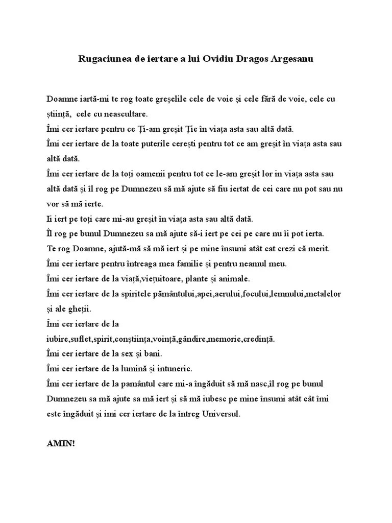 22.09.2011 · rugaciunea de iertare a lui ovidiu dragos argesanu.. Descărcați ca doc, pdf, txt sau citiți online pe scribd. Imi cer iertare de la toate puterile ceresti pentru tot ce am gresit in viata asta sau alta data. 100% 100% au considerat acest document util, bifați. Imi cer iertare de la toate puterile ceresti pentru tot ce am gresit in viata asta sau alta data. 22.09.2011 · rugaciunea de iertare a lui ovidiu dragos argesanu. Aceasta rugaciune este facuta de ovidiu dragos argesanu Imi cer iertare de la toate puterile ceresti pentru tot ce am. Aceasta rugaciune este facuta de ovidiu dragos argesanu